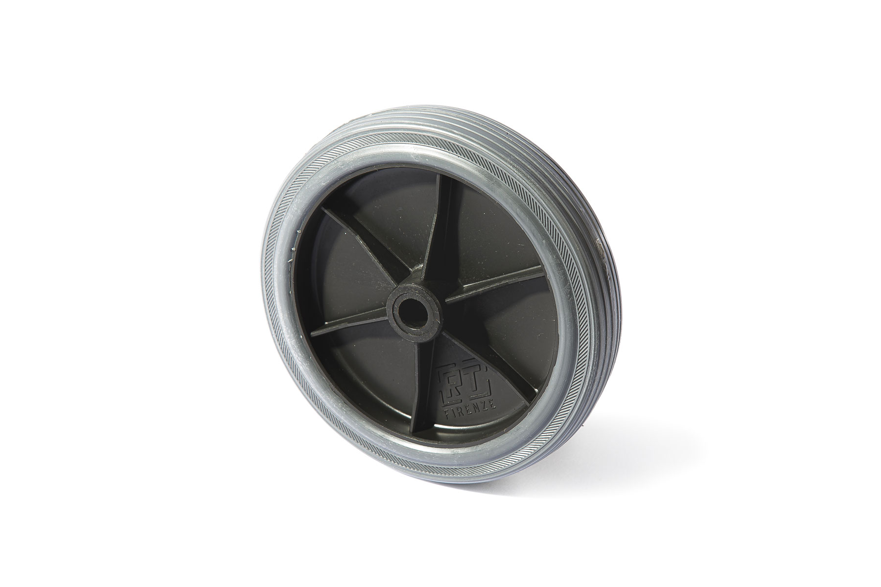 This is an industrial wheel with a robust polypropylene rim and RT NON MARKING-CLEANING tread coating. It can be used even in the presence of light hydrocarbons. It has good atmospheric resistance.